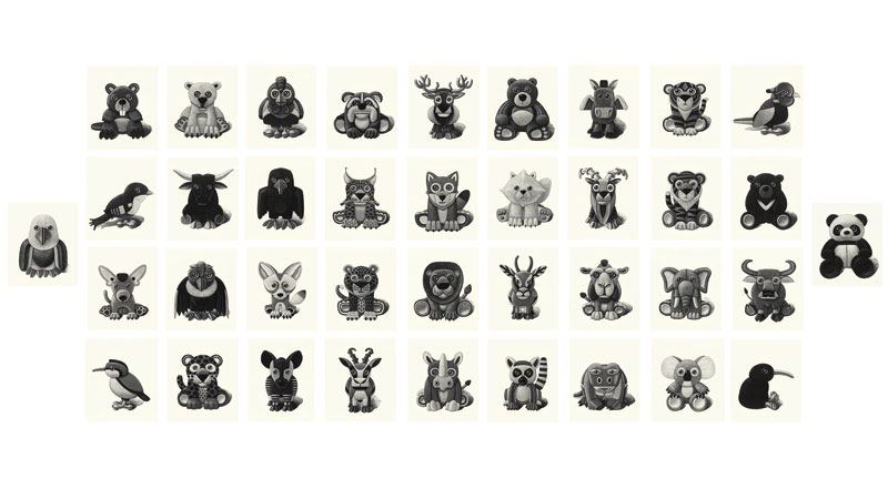 In his recreation of the stuffed animals Kempson’s prints engage in the toy world production of making representations of nature. Creating 50 prints the multiplicity of the different prints combined with the repetitive printmaking process amplifies the viewer’s awareness of this act of representing and copying nature. Showing their “true colours” (or absence of) in print form, the gimmicky and naive toys are further distanced from their attempted representation of the ‘real’ thing. In the commodification of the ‘wild’ animals, they are modified and resized as a soft toy.