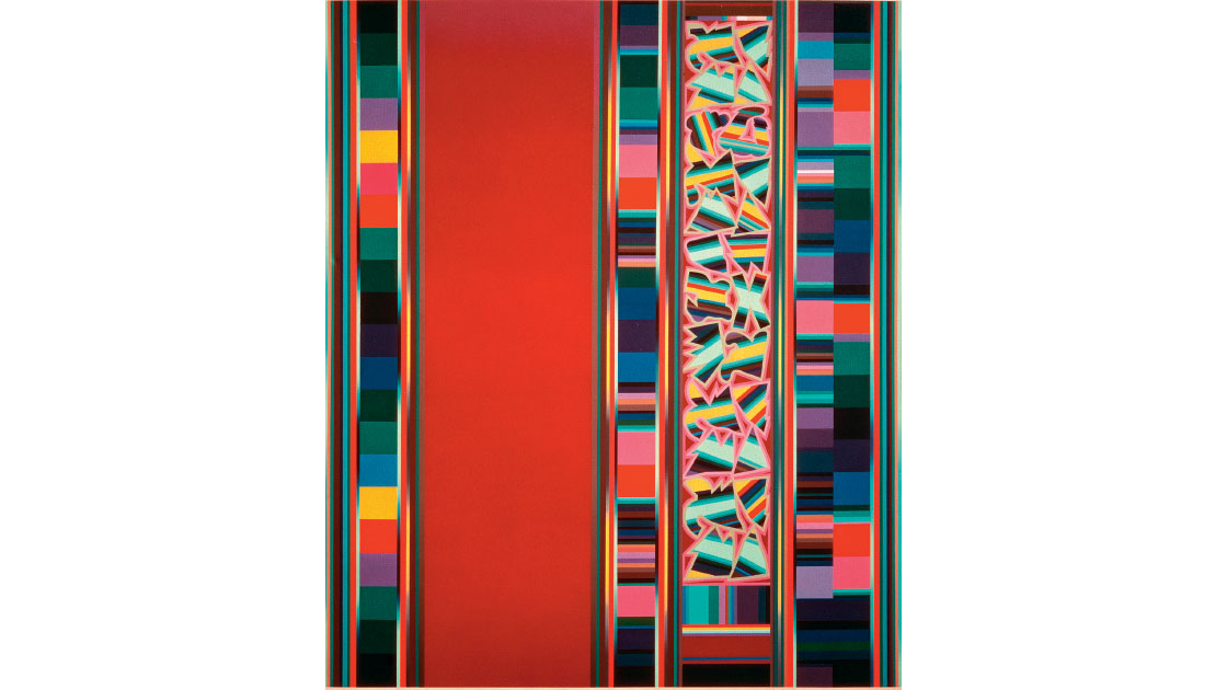 In 1976 Alun showed at Rudy Komon Gallery, Sydney, this time with even larger works where vertical divisions counterpointed areas of flat, intensely coloured space with cleanly delineated enclosures of complex elements. The paintings were immaculately executed in the manner of all of Alun’s works and they were titled with subtle and poetic referencing.