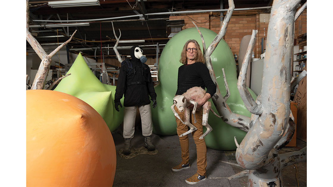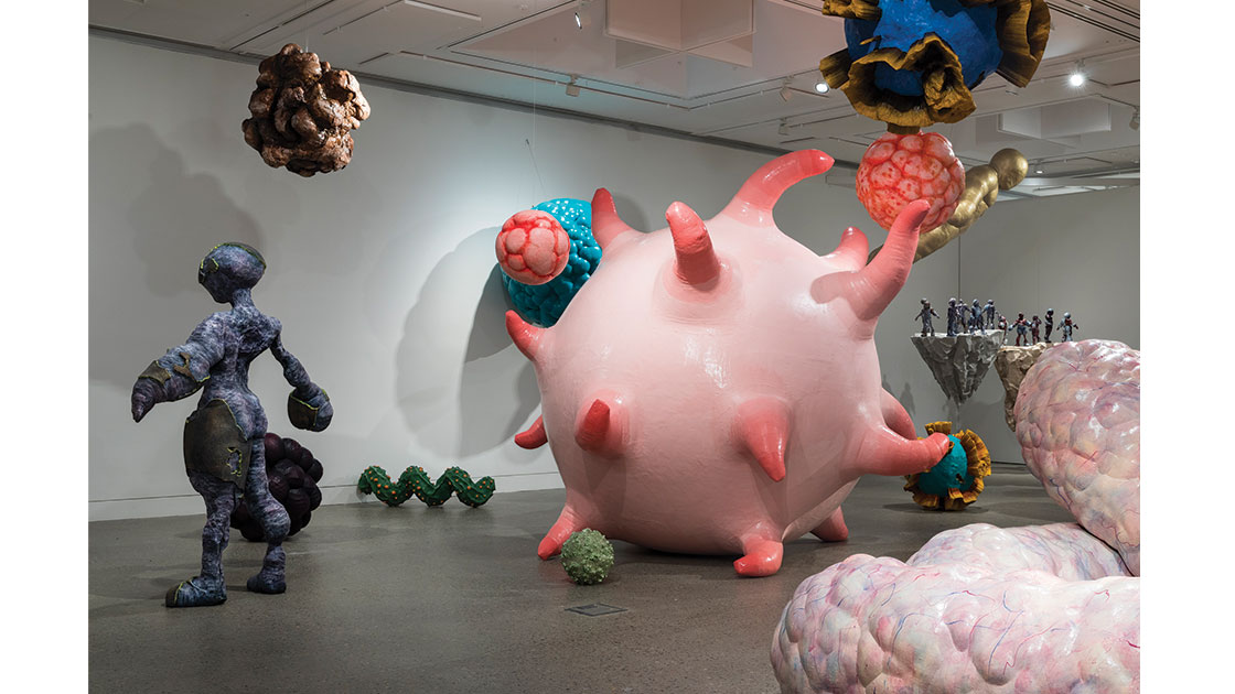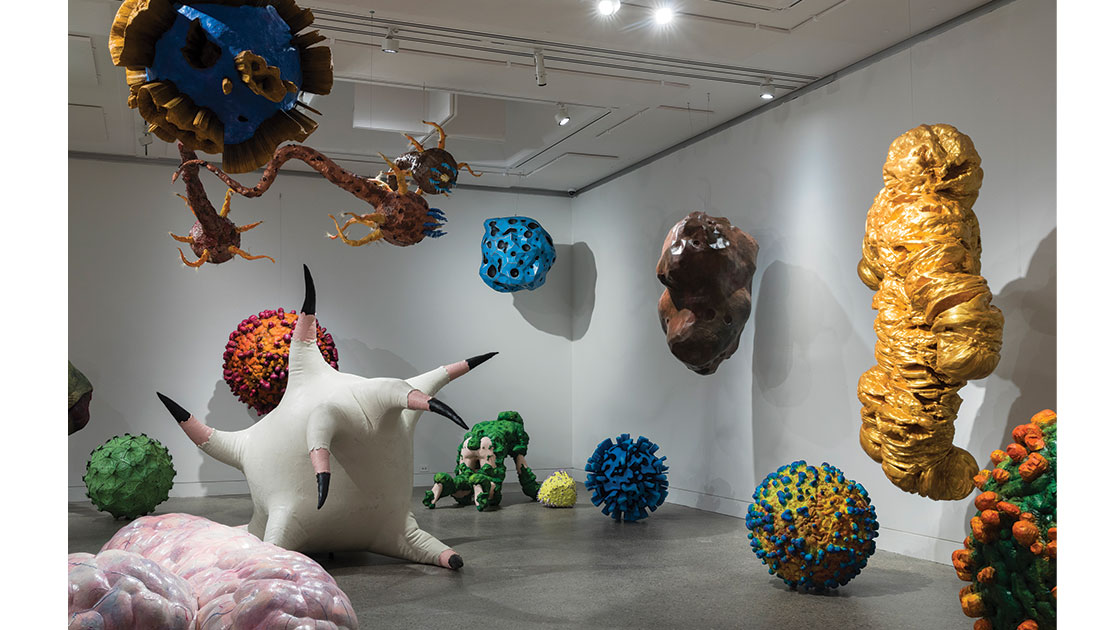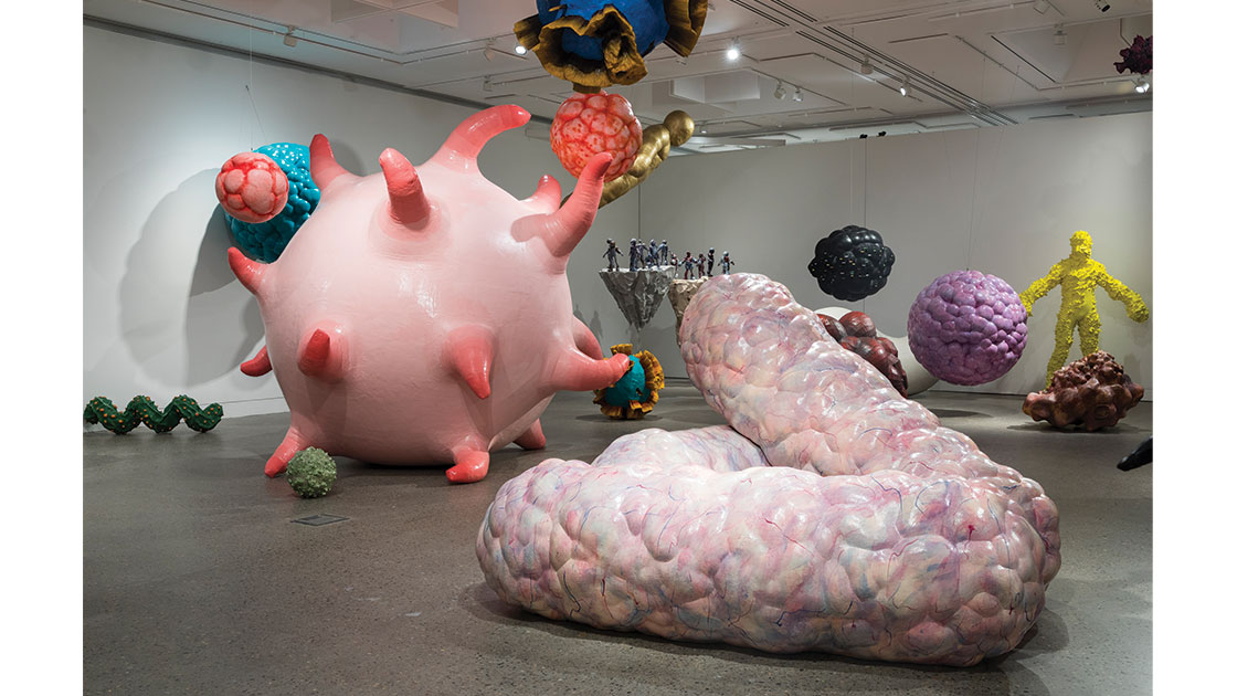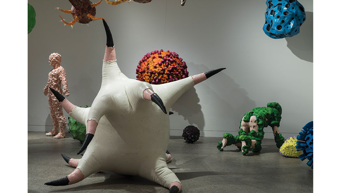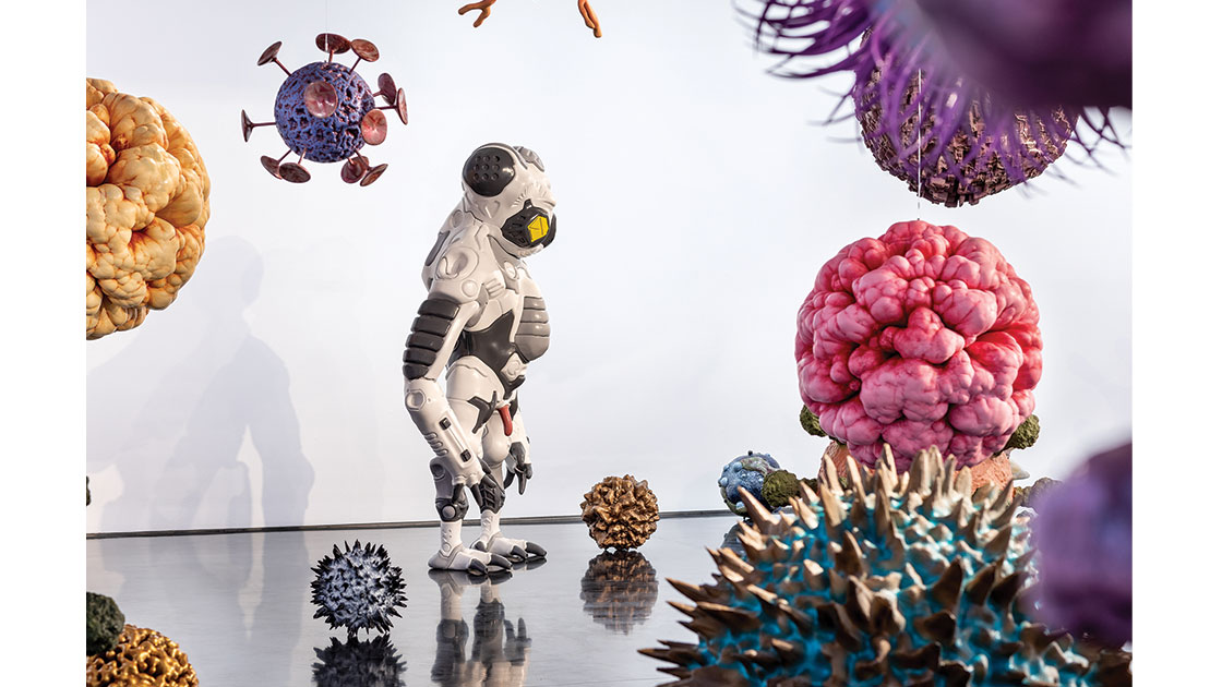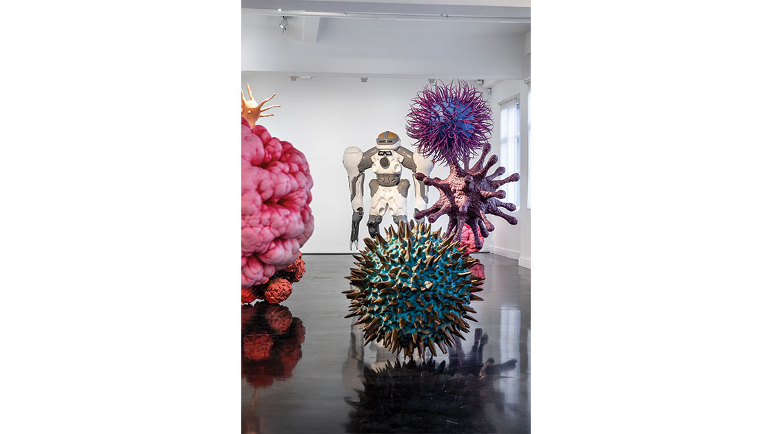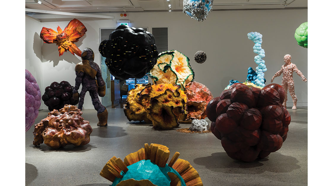My recent exhibition, Colony, at Tolarno Galleries in August 2019, was a large-scale immersive installation that was conceived after a personal experience of a viral infection. However, throughout the pandemic it’s metastasised into something more universal. In the installation, two figures in white protective suits are surrounded by a legion of brightly coloured globular forms that fill the gallery space like an army of greatly expanded microorganisms, bacteria, viruses and fungi, along with scaled-down asteroids and space-junk forms. Some of these presences, which range in size from slightly larger than a soccer ball to well over human-scale, float in the air, while others perch or have landed on the ground. Their size, configuration, and bright colours make them seem kind of like cartoon sci-fi – which makes them strangely appealing – but there is also a sense of foreboding and dread in them coming together: a sense of something about to happen, and over which we have no control. Is this a peaceful coexistence?