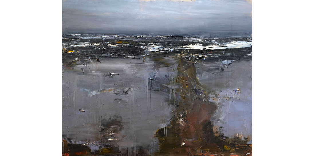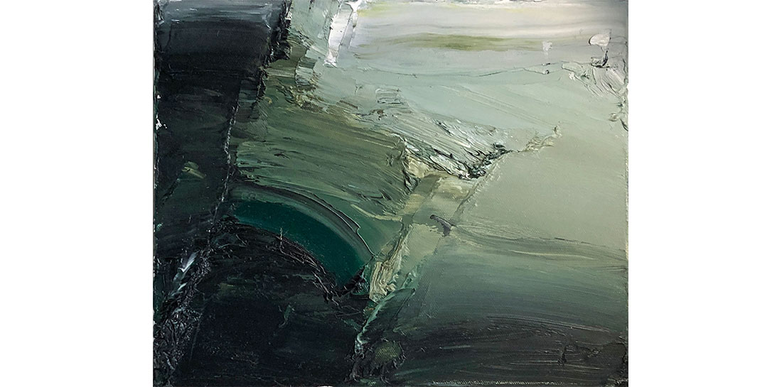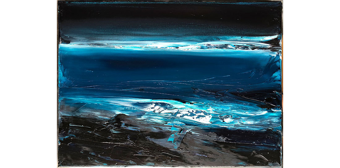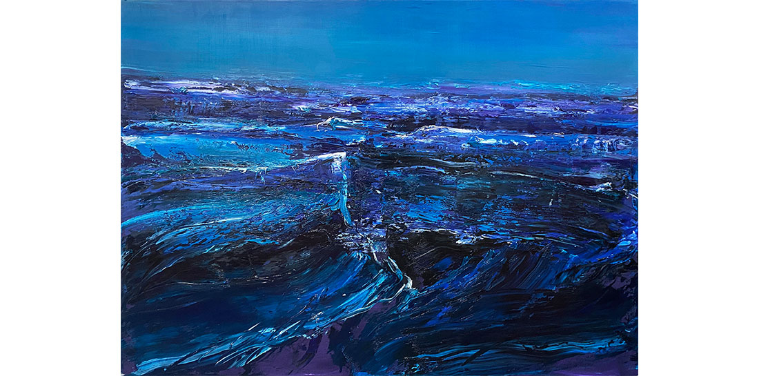 Blue Series II (2018) also strikes at this harmony between joyful engagement with the natural world, and an apprehension of the loss which is layered, always already, into its ground. Between two flashes of white stretches a sea so smooth and deep it looks like polished glass: examinable, and in Dyer’s case, well examined. On the shore, in the foreground, a single wave of electric blue breaks across the rocks, and the exterior things fall away.