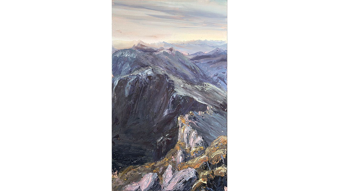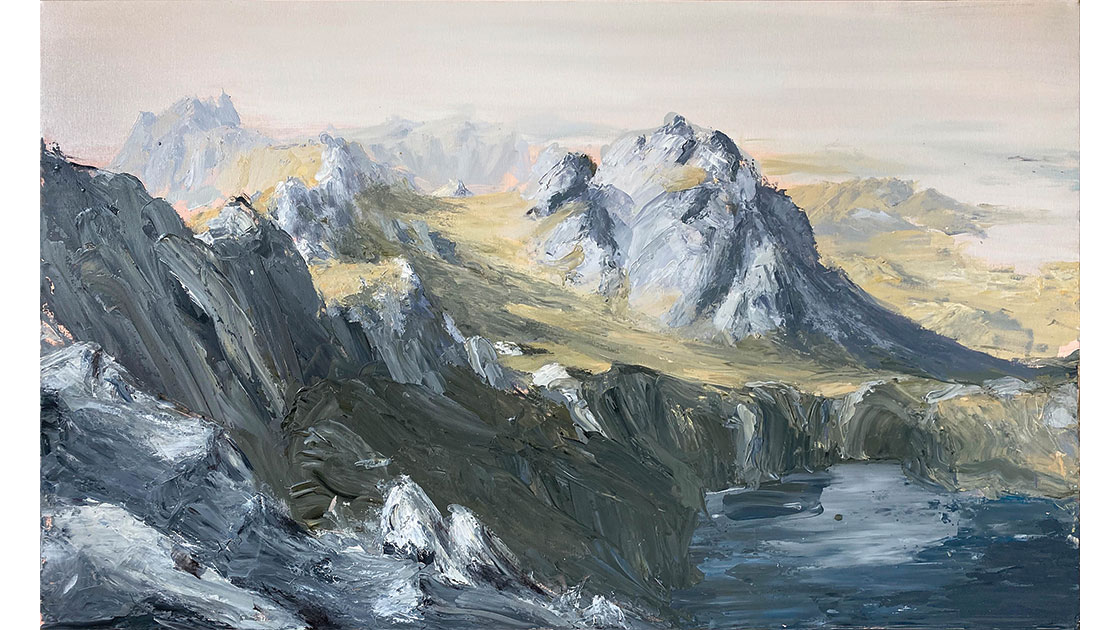 Harrison Bowe’s work, showing alongside Kennedy’s, opens into entirely different technical and art-historical vistas. Deliciously tactile, Bowe’s large-scale canvases call on much of what we’d recognise as a Romantic approach to painting landscape: they situate the viewer right along the sharp edges of ridges, or rolling down steep and rocky hillsides, and in some moments, in paintings like Pandanis under Double Peak, 2022, gestural strokes verge into the territory of pure, abstracted mark-making.