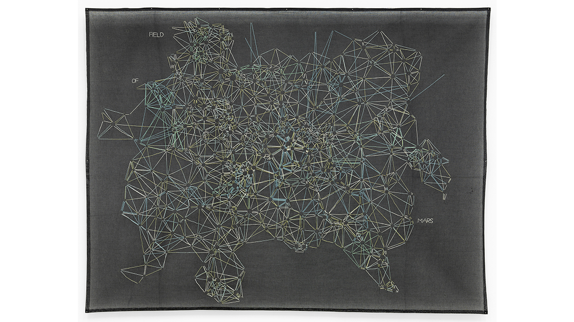 Throughout Field of Mars the textual arrangements and word collages created by the artist are composed and recomposed using chance methodologies. Embroidering abstract landscapes, Rankin creates psycho-geographic maps that stem from her recollections and internal experiences. Layered with codes and constellations, the works are embedded in memory and a dialogue with the self.