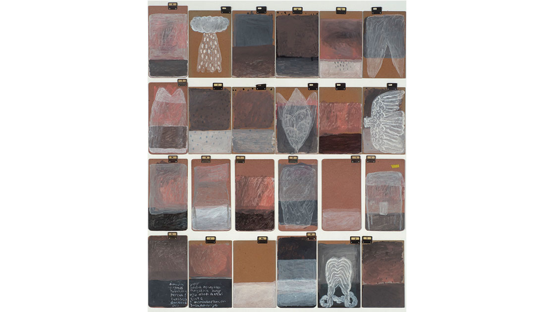 Continuing Jumaadi’s interest in history of migration and exchange between Australia and Indonesia, the artist states, “the works are acrylic painted on filing boards that I sourced in Cowra during a residency program, while my main focus was to trace the history of 1200 Indonesian political prisoners taken by the Dutch to Cowra from Digul during WWII (1943). The boards have been in my custody the last few years and the conversation taking place in various studios – Cowra, Sydney, Java – until we arrive in a conclusion, the composition.”