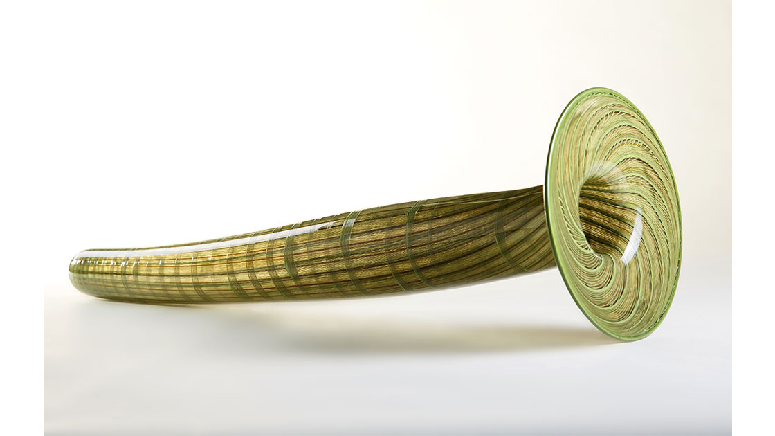 This idea of redirecting is exactly what her works do. Working with glass has refocused attention to the dilly bags and eel traps, as Martiniello embraces the contrasts in form, medium and colour to create new articulations. ‘The woven objects are ephemeral to some extent because they age and lose shape, and I get to produce a more lasting form in glass.’ Drawing directly from nature, Martiniello subverts the European palette of the glass canes to articulate the natural tones intrinsic to woven works. ‘The colour range – from the fresh-cut greens of the bulrushes to the aged object – there is huge variation. It gives me a lot to experiment and play with.’
