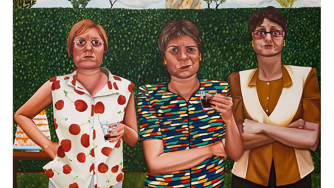 My work articulates my fascination with taste and expressing one’s social status and personal pride through material things and using them as subtle cues. For these women, the ones that try hardest to appear superior are the ones most uncomfortable with their lack of taste. The correlation to their identity, of inferiority and superiority, is exaggerated by the medium of painting, where time with oils adds prestige to their kitsch. This is seen most clearly in Pip also brought Pavlova, where the social etiquette of not bringing the proper thing to a garden tea party has raised the hackles of these three women.