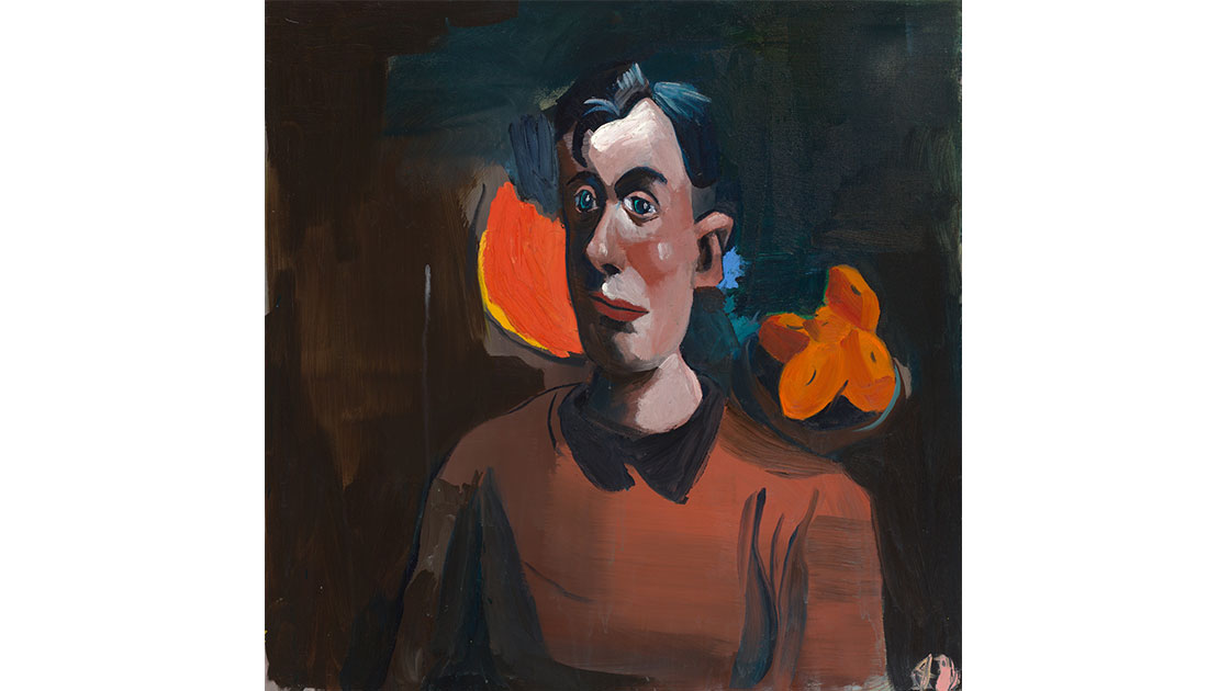 The Boy (2019) has quite a different air to the other figures. Edwards’ work is unswervingly figurative, a form of portraiture that often uses a classic three-quarter format (showing head and torso of the subject). At the same time it resists realism, verging instead towards caricature, the cartoonesque. This is especially evident in paintings that feature dogs, such as The Keeper of the Keys (2007), where two dogs with their mustard-yellow, rounded and simplified physiognomies resemble Pluto or Goofy. Some of the human figures, too, have exaggerated and clownish features and gestures – something of the buffoon and a tone that art critic Andrew Frost describes as ‘sour comedy’.