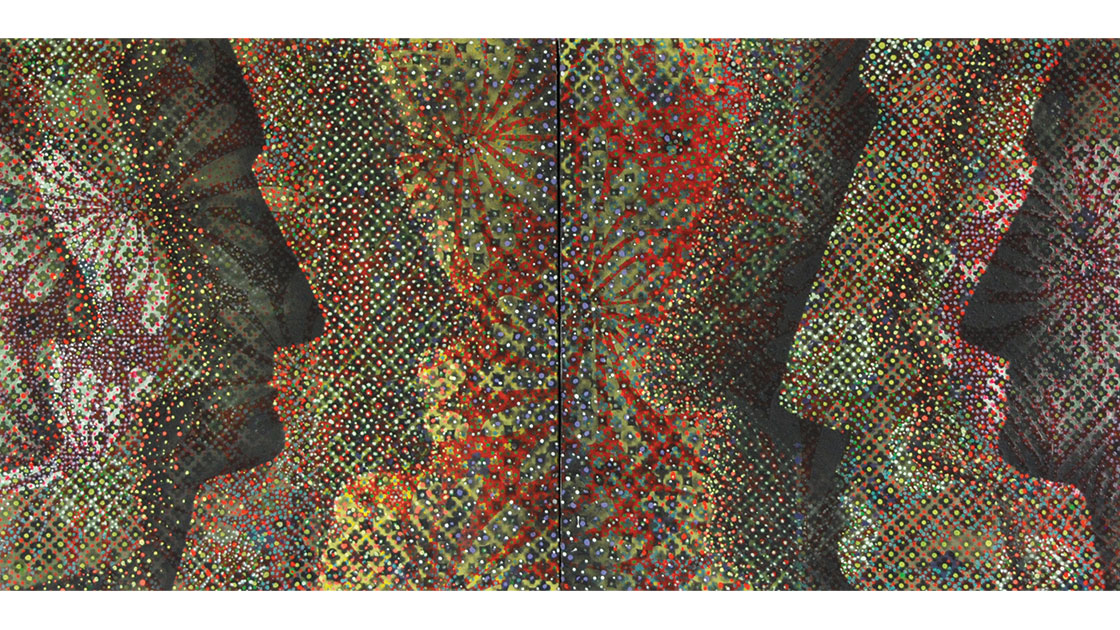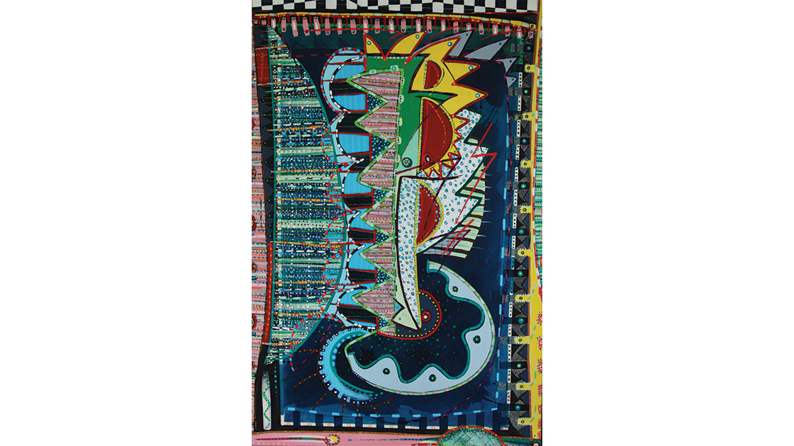 Blondel’s recent artworks feature alongside selected earlier works in this exhibition, including Apparition of The Mythmaker, 1983. In this work, you can see Blondel’s early interest in colour and complex pattern, influenced by artists like Janet Dawson and Picasso, as well as street art and tribal art forms and compositions. However, in his more recent work, such as Pandemic Heads Suite, 2020, pattern is heightened along with his vivid use of colour, which accentuates the graphic impact of Blondel’s work as he moves towards more figurative compositions. Conceptually, the exhibition explores this interiority of abstraction in Blondel’s work, and gives form to unanticipated connections within the mind.