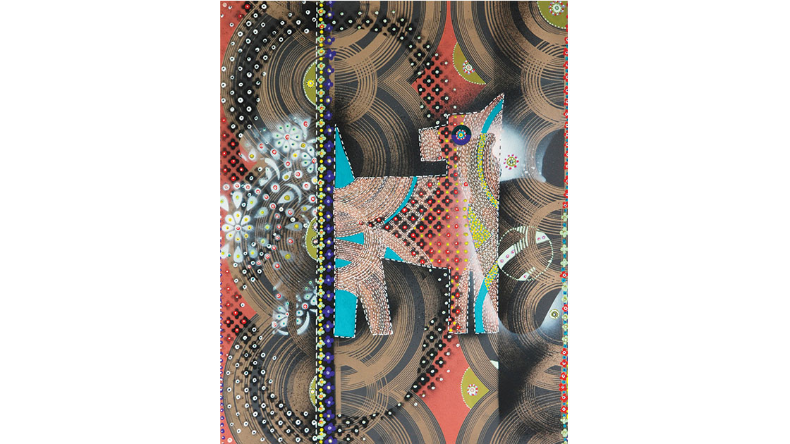 The title MindScapes fits perfectly. Abstracted pattern vies with more figurative gestures; here a pair of eyes, there a silhouette. Blondel explains that these works aren’t planned, they are created instinctively on the spot. Imaginative compositions that he adds to again and again until the layers work together. In his more recent artworks, the artist started with old, patterned wallpapers, which he then worked over in this layered way. “I make it [the wallpaper pattern] disappear to a degree or integrate it into the layering of images,” he explains. “They’re quite graphic, quite densely populated.”