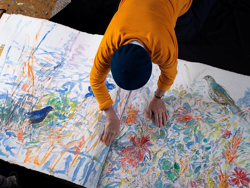 Salvatore Zofrea, with his book Australian Flora and Fauna, 2021-25, pen, pencil, watercolour; handmade French paper (40 images on 20 leaves), 100 x 100 cm. Photographed by Effy Alexakis