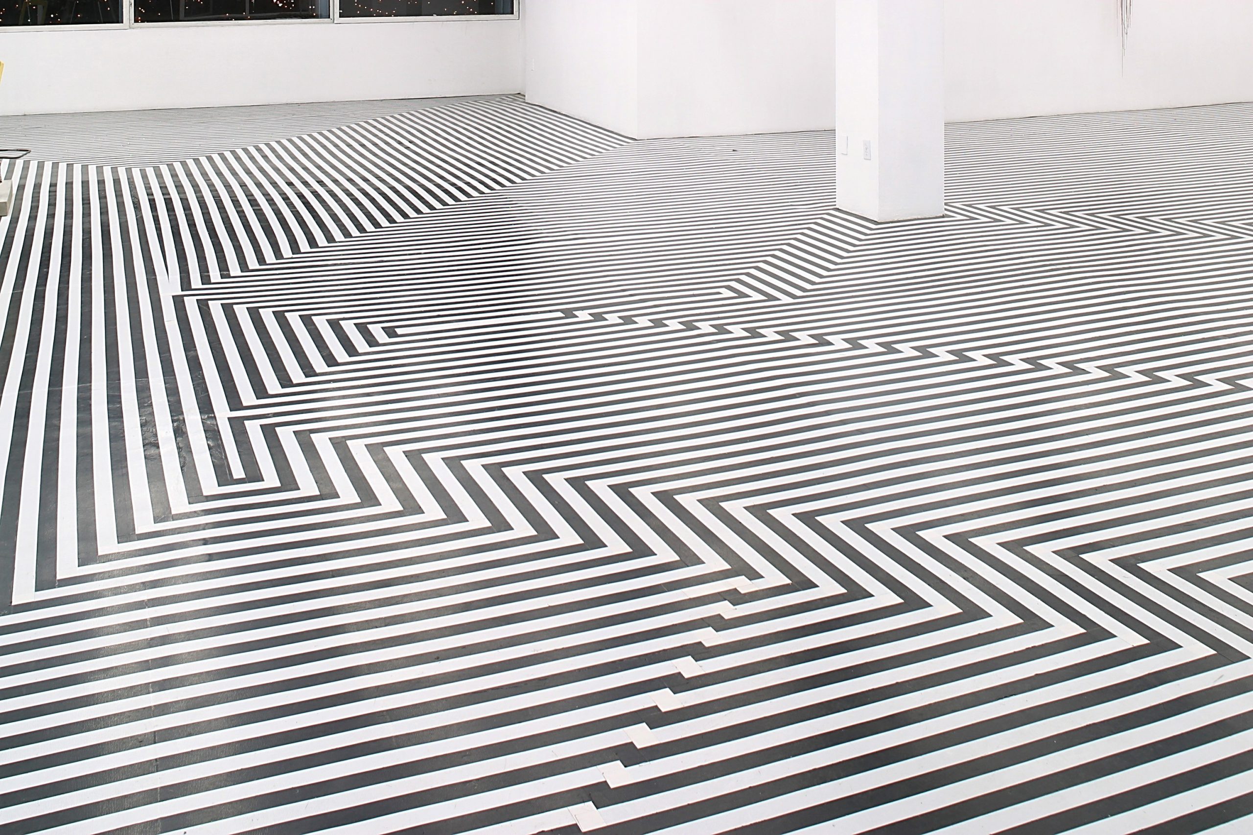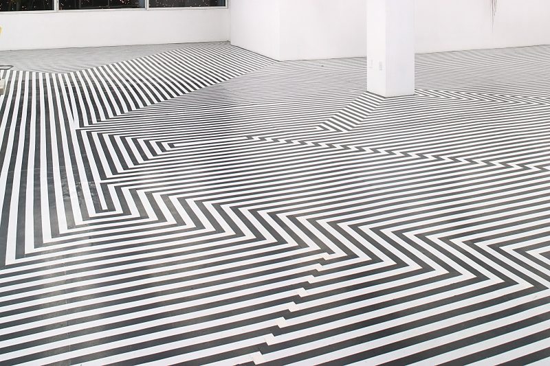 Installation view detail, Zobop Broadband (Black and White), 2003, black and white vinyl tape, dimensions variable, edition of 3 plus 1 artist’s proof. Exhibition, Grand Funk, OPA, Mexico, 2004.