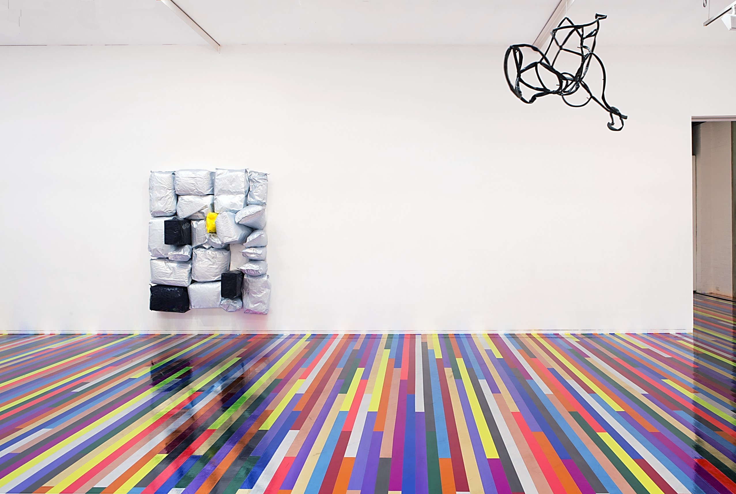 Having trained as a painter, Lambie’s reputation as a colourist precedes him. His use of colour over the years calls to mind Frank Stella’s famous comment, “Straight out of the can—it can’t get better than that.” In Australian terms, one thinks of the great colourist Michael Johnson and his ecstasy when applying colour straight from the tube. Lambie has used paint sprayed from a cannister or splashed from a tin across objects and installations—even Zobop’s colour is to a great extent prescribed by the availability of vinyl tape from commercial manufacturers. That purity of colour, along with the confinement to found objects that come to hand, is equivalent to a poet’s metre—a hemming in, so that one might have bounds from which to break free.