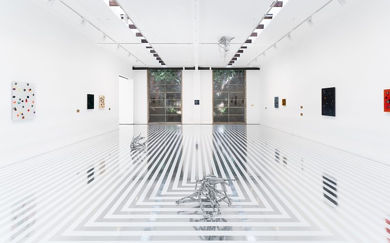 For Jim Lambie, tape is a medium. After making works by resurfacing clothes with tape in the late nineties, Lambie created his initial Zobop installation on the floor of his first solo exhibition with Transmission Gallery, Glasgow, in 1999. In so doing, he created a singular system for engaging with exhibition spaces that he has continued to use, to great effect and acclaim, ever since. “Starting with a single strip of vinyl tape,” says Lambie, “I trace the architectural edge of the room, following each previous line until the work meets itself in the middle. People often see rhythm, colour, and the sense of industry involved. However, my initial concern was ‘how to fill a space and empty it at the same time.’ Once I imagined the whole surface of the floor as a site for that question, the sticky tape I had been using to knock together smaller sculptures suddenly became the vehicle.”
