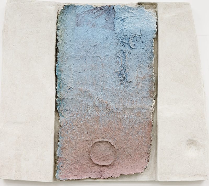Skyfade, 2025, acrylic, paper pulp, hessian, composite render, extruded polystyrene, wood, 92 x 80 x 7 cm