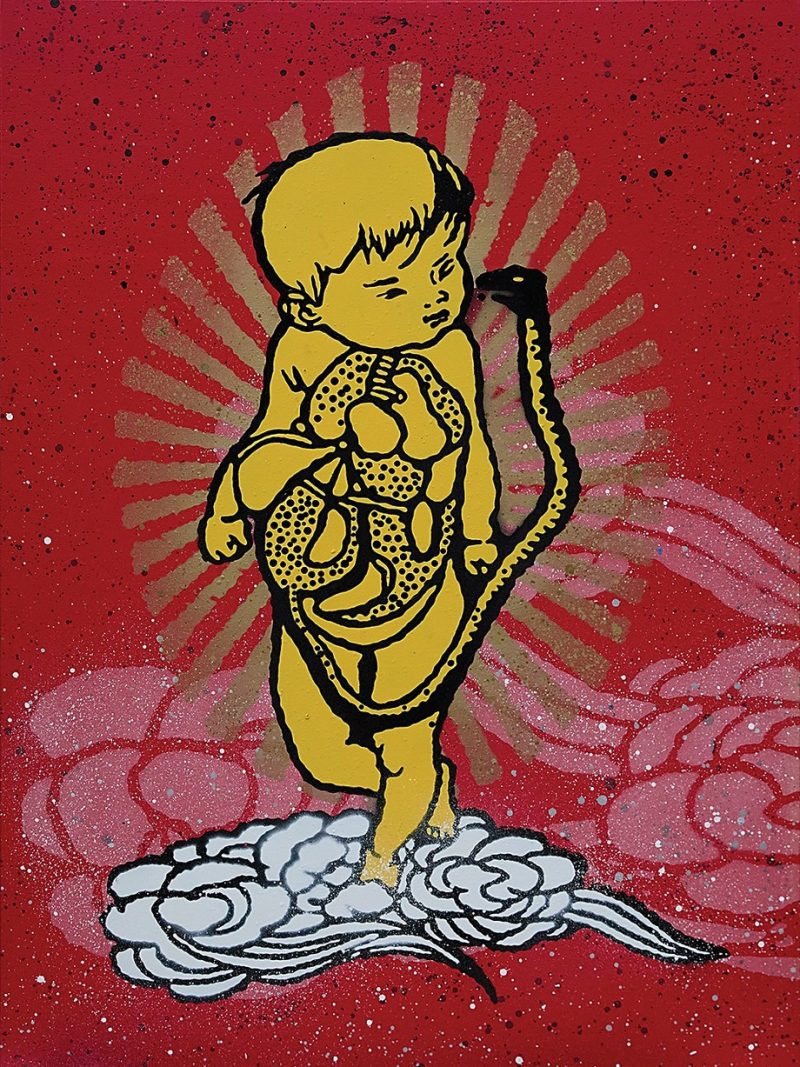 Jason Wing, Serpent People (Boy with Snake Belly), 2024, acrylic spray paint, canvas, 122 x 91cm