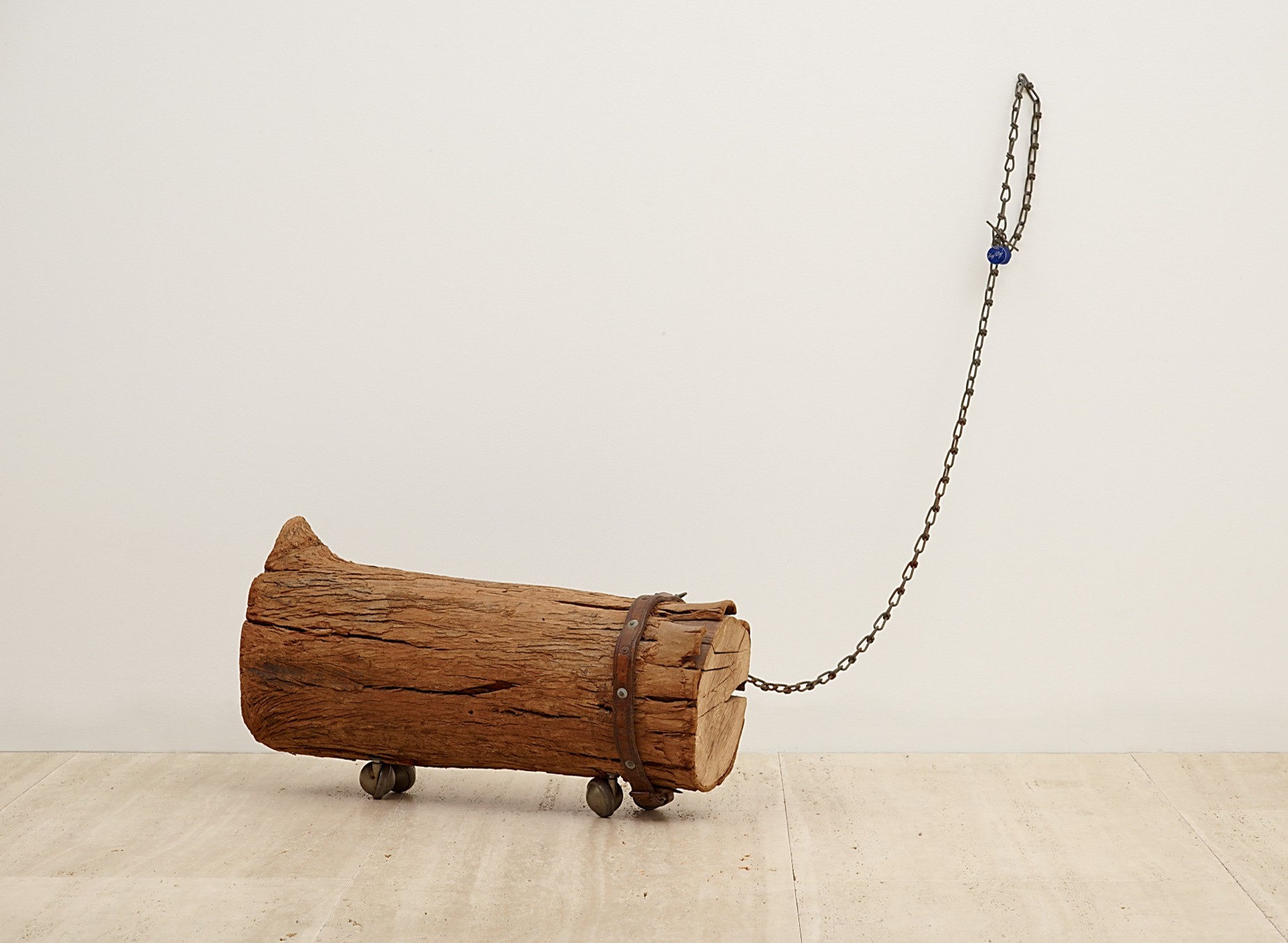 Next to Gilbert & George is Richard Long’s 1992 sculpture Spring Showers Circle, a collection of jagged wooden shapes likely inspired by his walks in England and abroad. The Australian performance artist, Aleks Danko, is not taking his Log dog, 1970, for a walk, but he could; it’s here imagined as a log on wheels with a chain attaching it to a white screen.