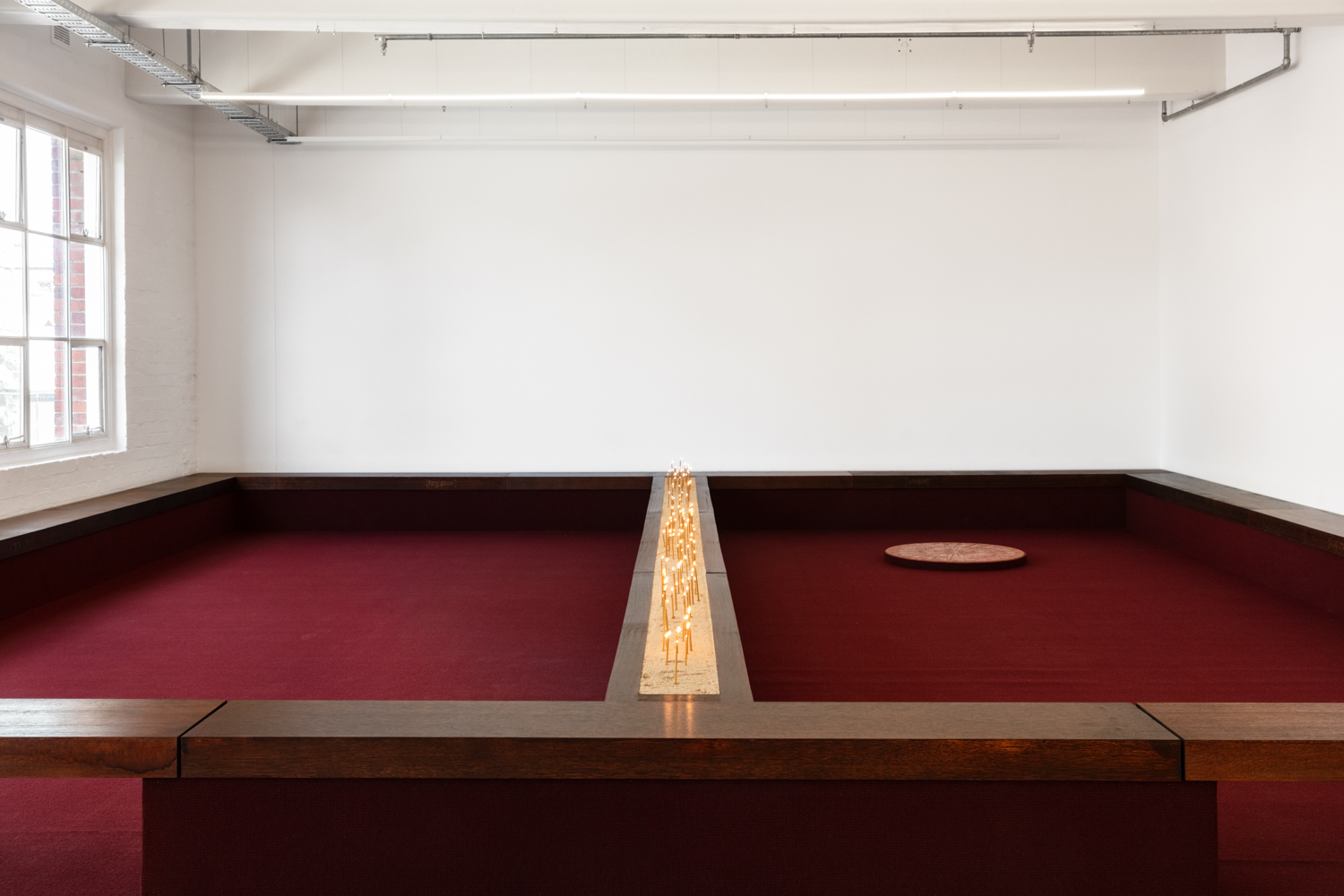 The displacement of the chips and the removal of the triangular motif from the board feel like another act of silence, as if the game’s original function has been suspended. The carpet, replacing the expected wooden surface, absorbs and disguises sound. A wooden barrier filled with sand divides the board into two halves, with candles planted along its length. Drawing on the sensibilities of artisan craftsmanship and the languages of interior and industrial design, Tina Stefanou reimagines the environment as something to be inhabited.
