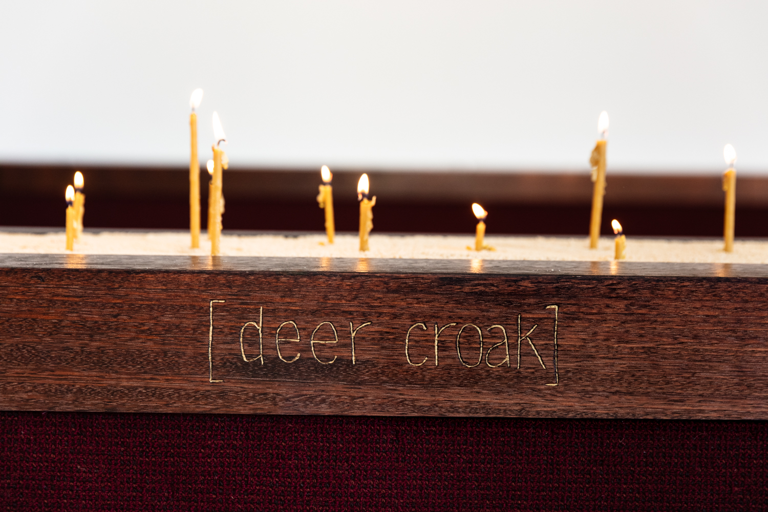 By the time I left West Space, I realised that sound does not need to be audible to exist. The exhibition’s title, Motet Fail, reflects this central idea, suggesting a “failed harmony.” Sound is present everywhere, though not in a conventional, harmonious way. A motet, from the French, refers to a vocal composition, a polyphonic piece in which multiple independent melodic lines come together. Here, Stefanou creates a polyphonic piece without sound. Stillness and silence are themselves charged, resonating in memory, the mind, and across culture. They flicker in candlelight, linger in engraved words, and settle into the burgundy carpet and surrounding wooden benches.