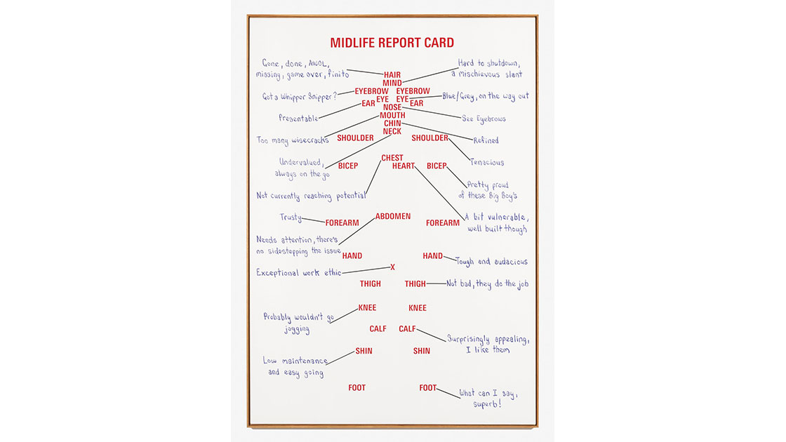 In a way, too, Michael Lindeman’s Midlife Report Card (Selfie) (2019) defies some conventions of the nude, as there is no actual body pictured. Instead, parts of the subject’s body are labelled and their function described: the mouth spurts ‘too many wisecracks’, the heart is ‘a bit vulnerable’, and an ‘x’ where ‘penis’ should be (is this defiance, or shame?) has an ‘exceptional work ethic’. It’s funny, but troublingly so. Berger’s formulation of woman as appearance and man as action couldn’t be more literally reiterated. Here, the masculine subject is defined by how he works in the world, where even Rodgerson’s self-defining figure aims at a vision of feminine selfhood grounded in the bodily form.