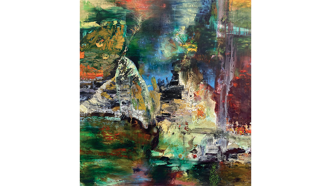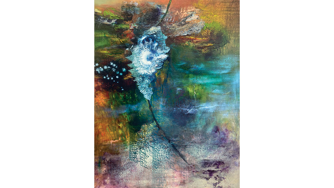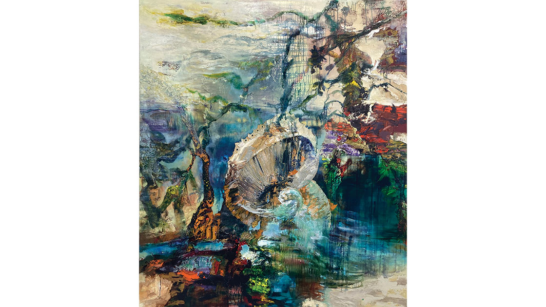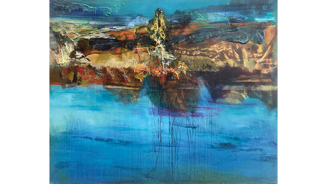 The texture of the oil paint in Todd Jenkins’s Lunar Current, 2022, is at once delicate and densely packed onto the canvas. There is a sense that the painting is calling out be touched, as well as to be explored by the eye. Though the painting’s title suggests the moon-led movements of the oceans around Tasmania, the rich blues, the tactility of the painted forms, and the shifting waft of the perspective lend the work a mood which is also distinctly sublunary – one of mystery and of fascination with the natural world.
