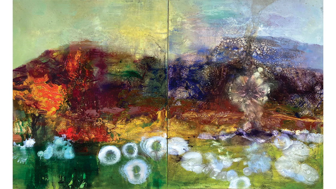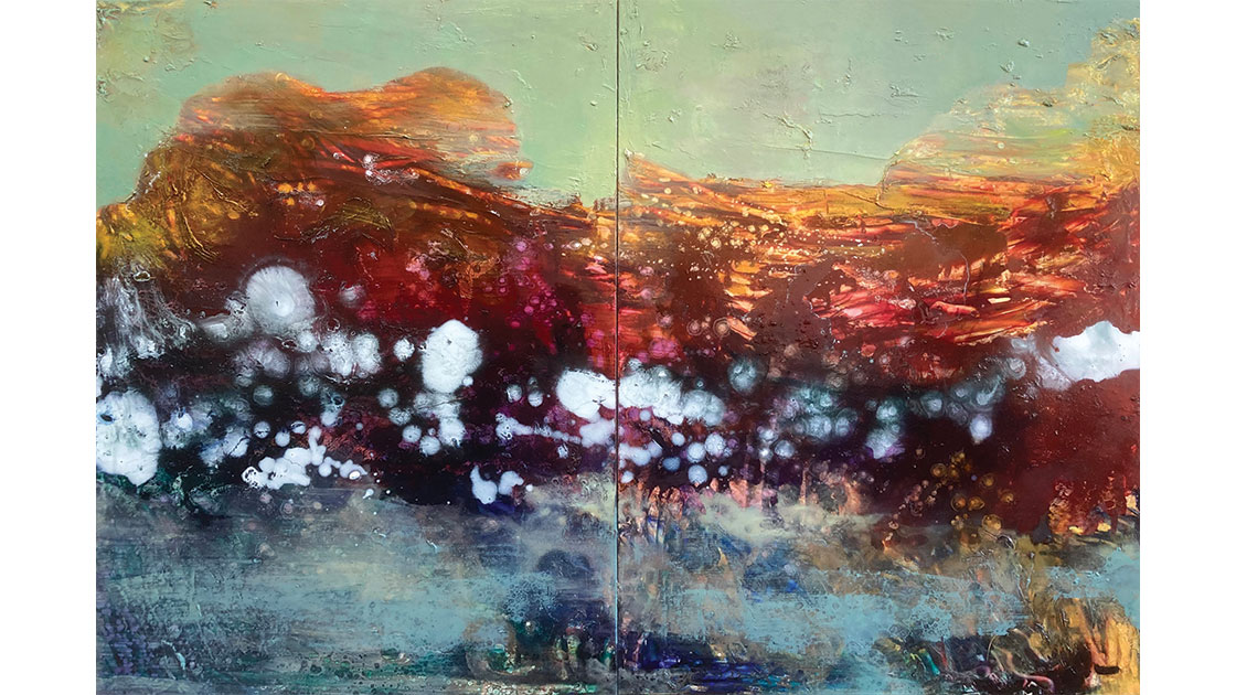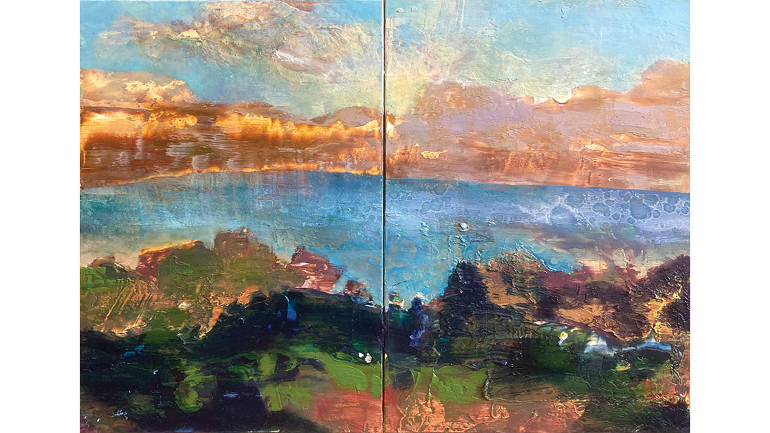 Keeping a visual diary over this period, Jenkins then returned to the studio and painted from both his documentation and from memory. These images, that is, are soaked through with emotion. They are textured with Jenkins’s subjectivity, and his emotional and intellectual relationships to the regions he recalls so fondly in his work. In a poem appearing alongside the exhibition, Jenkins conjures in this remembered landscape “A friendship forged, / Patterns and textures, / A reflection of the past . . . ” Thus, though the tender washes which characterise many of the paintings – and their dazzling multi-point perspectives – reflect an acute awareness of the changing nature of the ecosystems Jenkins observes, these paintings are perhaps more focussed on continuity than loss – or the threat of loss. Perhaps this is because of the enduring nature of the beauty Jenkins finds in his surrounds, captured in works like Coastline (diptych), 2022, or Limpet (diptych), 2022. The artist has commented on his fascination with the “natural design elements in [the] form and structure” of the world around him, gesturing to a connection with intelligence and spirituality in the landscape which endures on the grand scales of ecological and geological time, threatened though it may be by rapid change today.